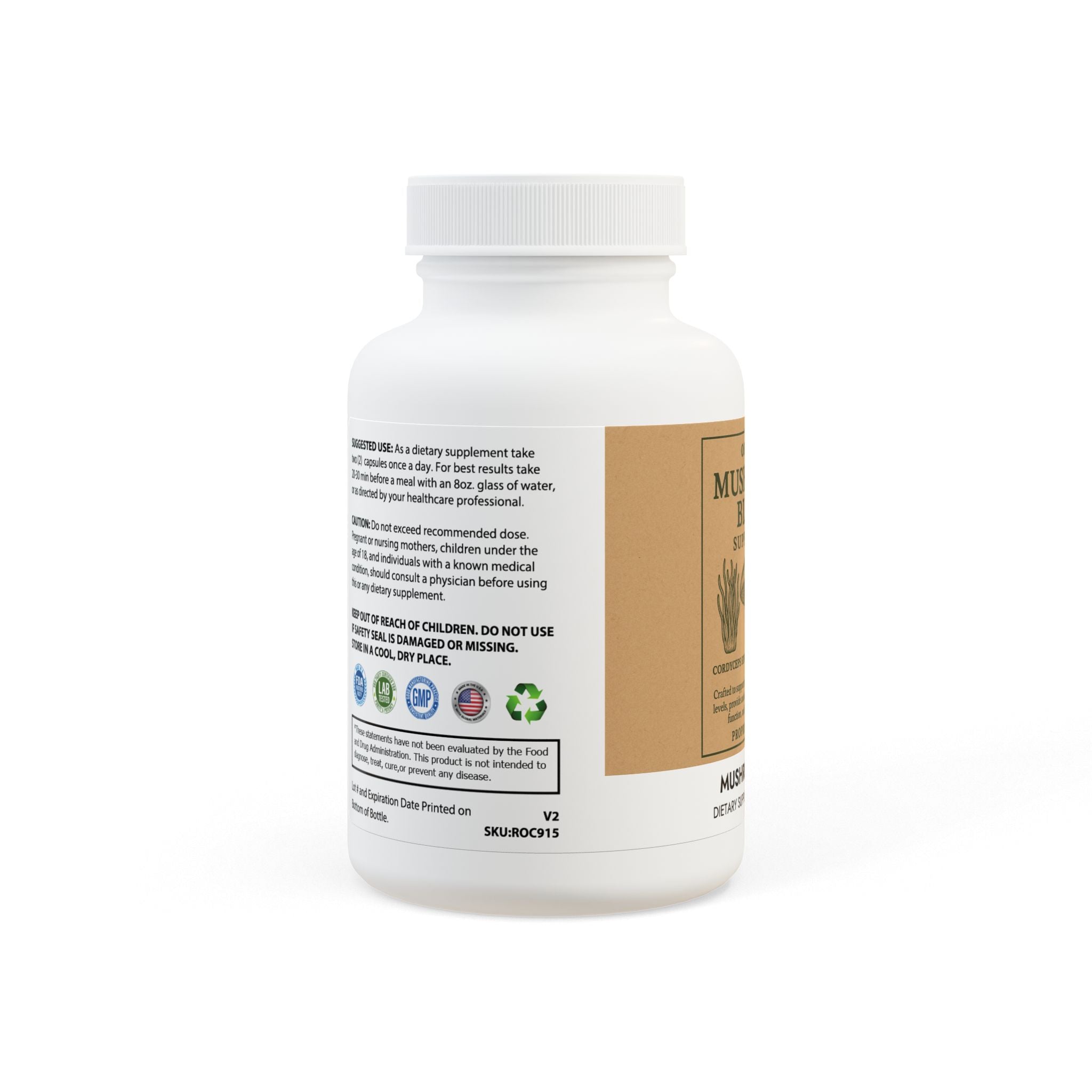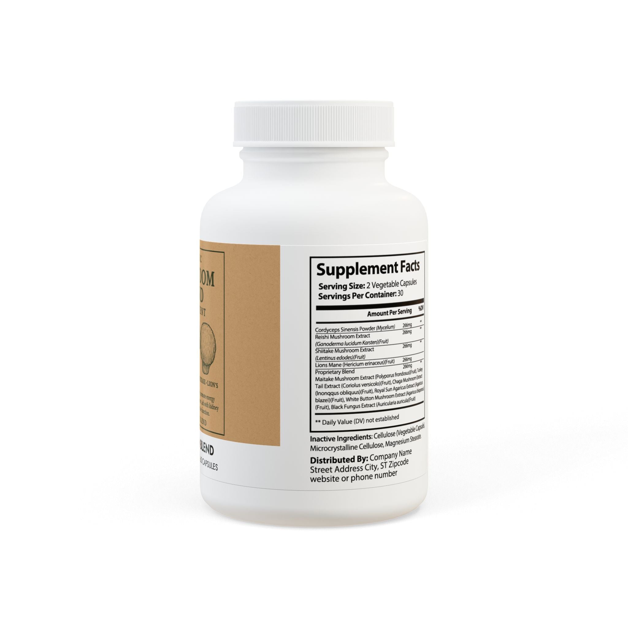 Ingredients: Cordyceps Sinensis Powder (Mycelium), Reishi Mushroom Extract, (Ganoderma lucidum Karsten)(Fruit), Shiitake Mushroom Extract, (Lentinus edodes)(Fruit), Lions Mane (Hericium erinaceus)(Fruit), Proprietary Blend, Maitake Mushroom Extract (Polyporus frondosus)(Fruit), Turkey Tail Extract (Coriolus versicolor)(Fruit), Chaga Mushroom Extract, (Inonqqus obliquus)(Fruit), Royal Sun Agaricus Extract (Agaricus blazei)(Fruit), White Button Mushroom Extract (Agaricus bisporus), (Fruit), Black Fungus Extract (Auricularia auricula)(Fruit), Cellulose (Vegetable Capsule), Microcrystalline Cellulose, Magnesium Stearate.