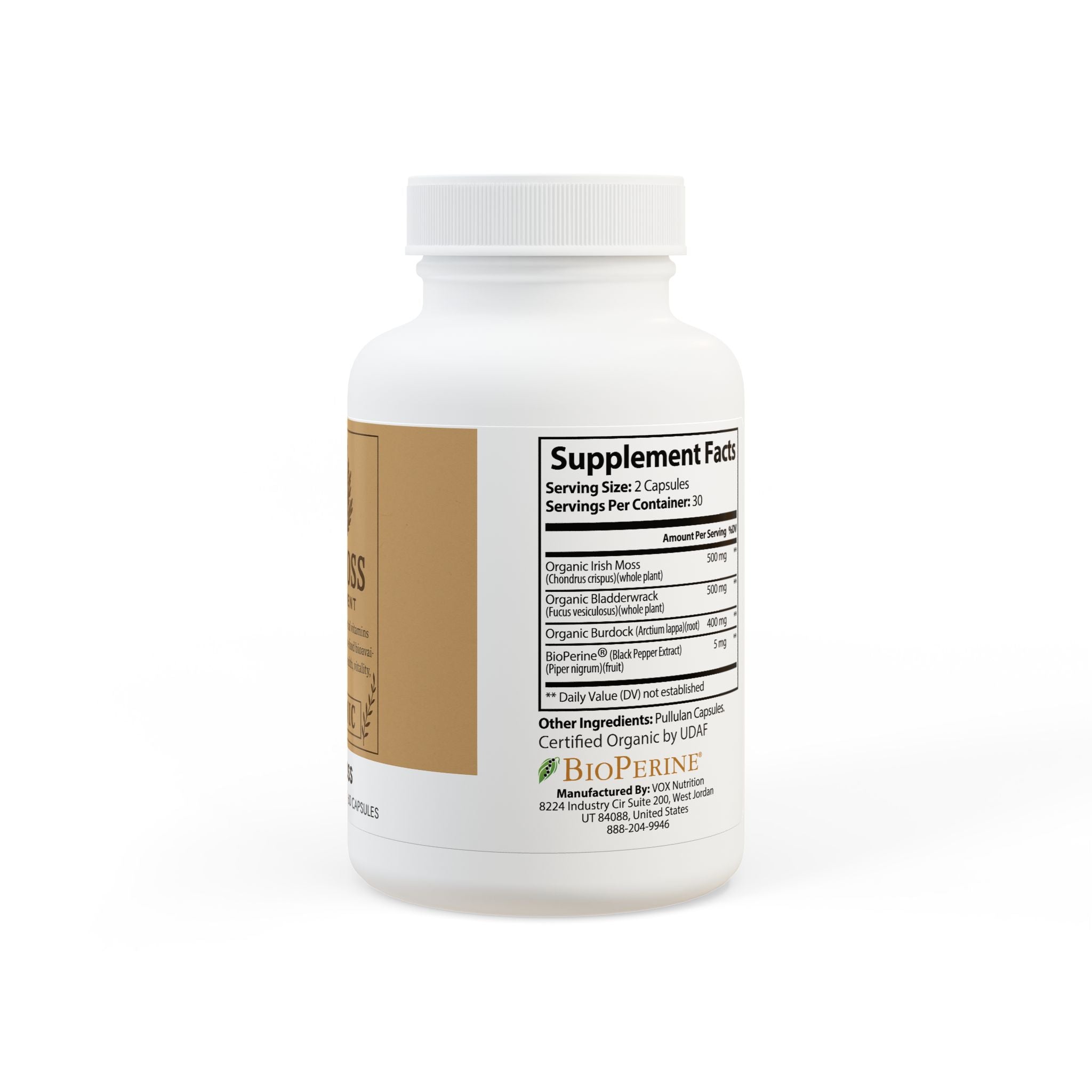 Ingredients: Organic Irish Moss (Chondrus crispus)(whole plant), Organic Burdock (Arctium lappa)(root), Organic Bladderwrack (Fucus vesiculosus)(whole plant), BioPerineĀ® (Black Pepper Extract), (Piper nigrum)(fruit). Other Ingredients: Pullulan Capsules.